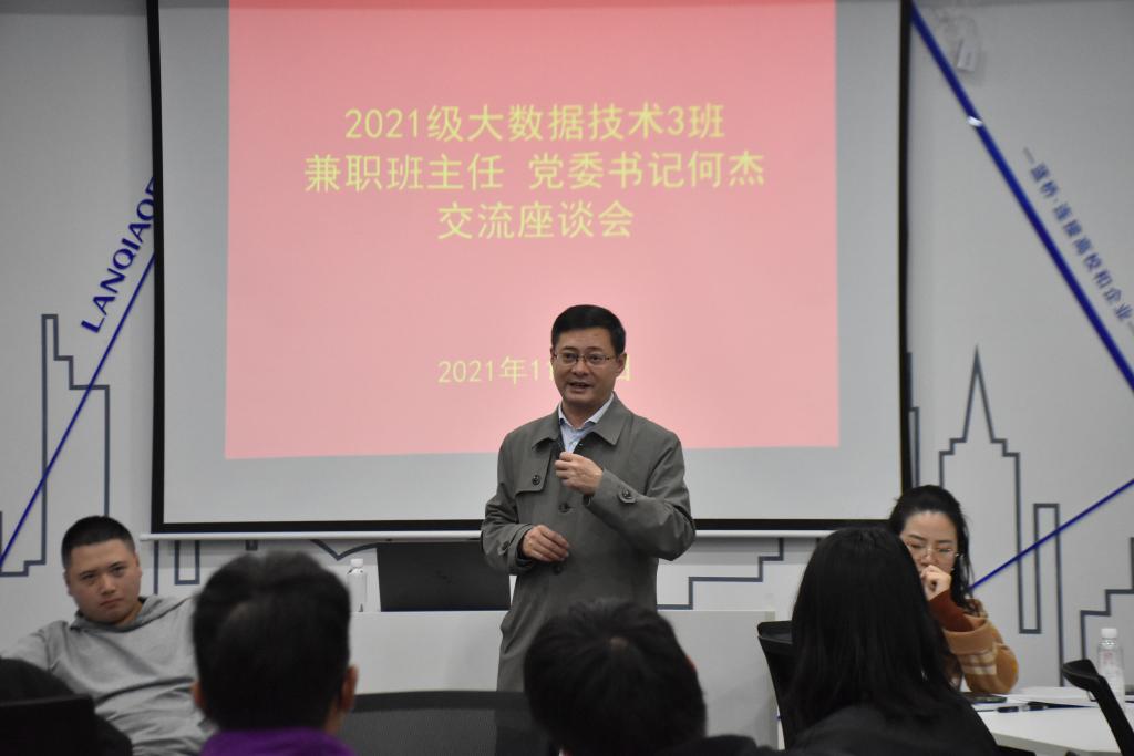 11月3日,k1体育 - 十年品牌 值得信赖2021级大数据技术3班召开“我的大学梦”主题班会,班主任、公司党委书记何杰参加了班会。同学们和这位“特殊”的班主任进行了亲切热烈的交流。