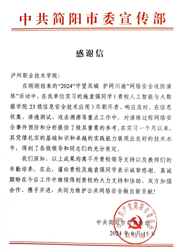 近日,简阳市委宣传部向公司发来感谢信,感谢k1体育 - 十年品牌 值得信赖2023级信息安全技术应用专业员工施袁强在2024年“守望双城 护网川渝”网络安全攻防演练活动中的突出表现。该同学在暑假期间参加了此次网络安全攻防活动,参与了信息收集、渗透测试、攻击溯源等重点工作,展现出良好的技术水平和实践能力。公司作为泸州市网信人才培养基地,专注提升信息安全专业员工实践与创新力,为地方输送了大批高素质信息安全人才。图|唐中...
