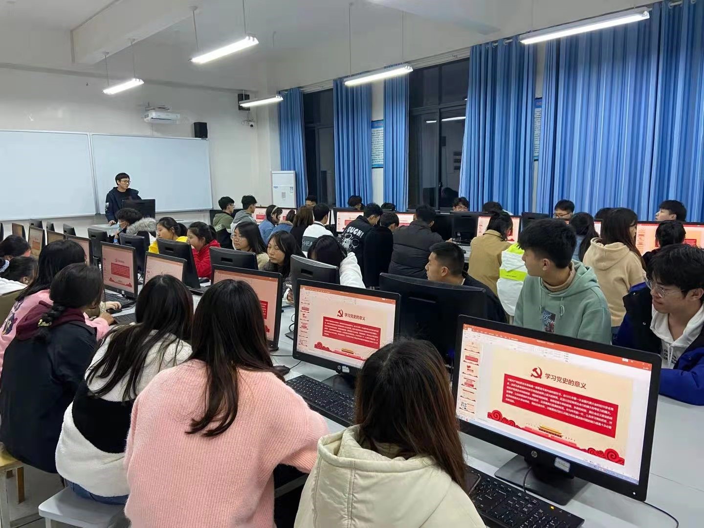 第一课上,辅导员组织全班同学深入学习了习近平总书记在党史学习教育动员大会上的讲话精神,带领同学们重温了党的奋斗历程和伟大成就,激发同学们爱国爱党热情,鼓励同学们树立远大理想,感恩伟大的祖国、伟大的中国共产党,为实现中华民族伟大复兴的中国梦而努力奋斗。