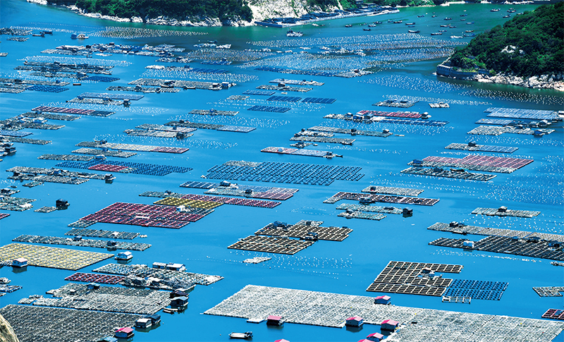 2022年8月15日,福建省连江县奇达村连成片的渔排宛如一座“海上牧场”(无人机照片)。奇达村是一个集齐了“山、海、岛、渔村”等元素的千年古村落,是天然的避风良港,适合养殖鲍鱼、海带等海产品。