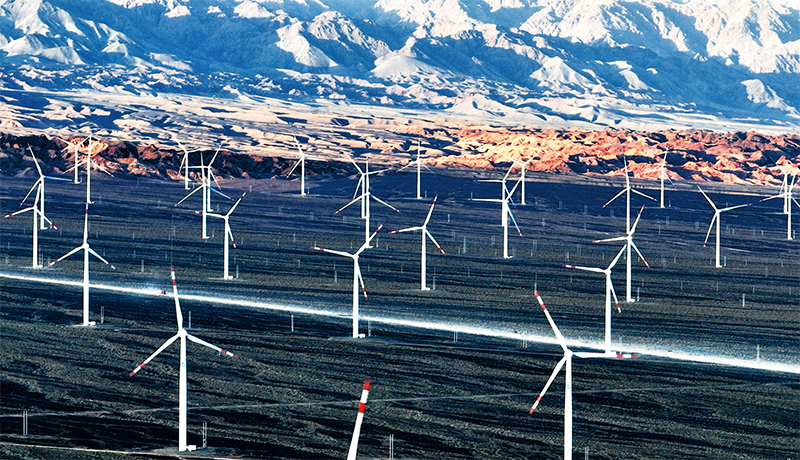 2022年5月21日,新疆生产建设兵团六师北塔山牧场刚刚建成的风力发电场风机林立,一派壮观的场面。