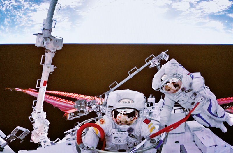 2022年9月2日零时33分,经过约6小时的出舱活动,神舟十四号航天员陈冬、刘洋、蔡旭哲密切协同,完成出舱活动期间全部既定任务,陈冬、刘洋已安全返回问天实验舱,出舱活动取得圆满成功。图为9月2日在北京航天飞行控制中心拍摄的神舟十四号航天员结束出舱任务正在返回的画面。