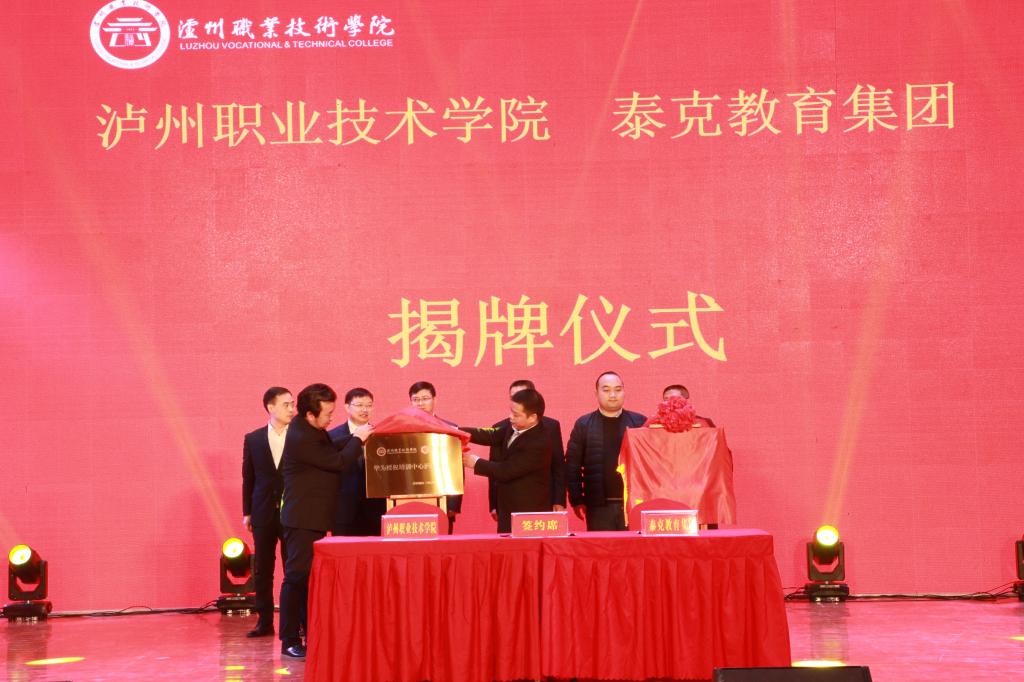 集团副经理彭涛与泰克教育集团西区总监蒲茂荣为“华为授权培训中心泸州市分部”和“华为ICT公司西南培训基地”揭牌。
