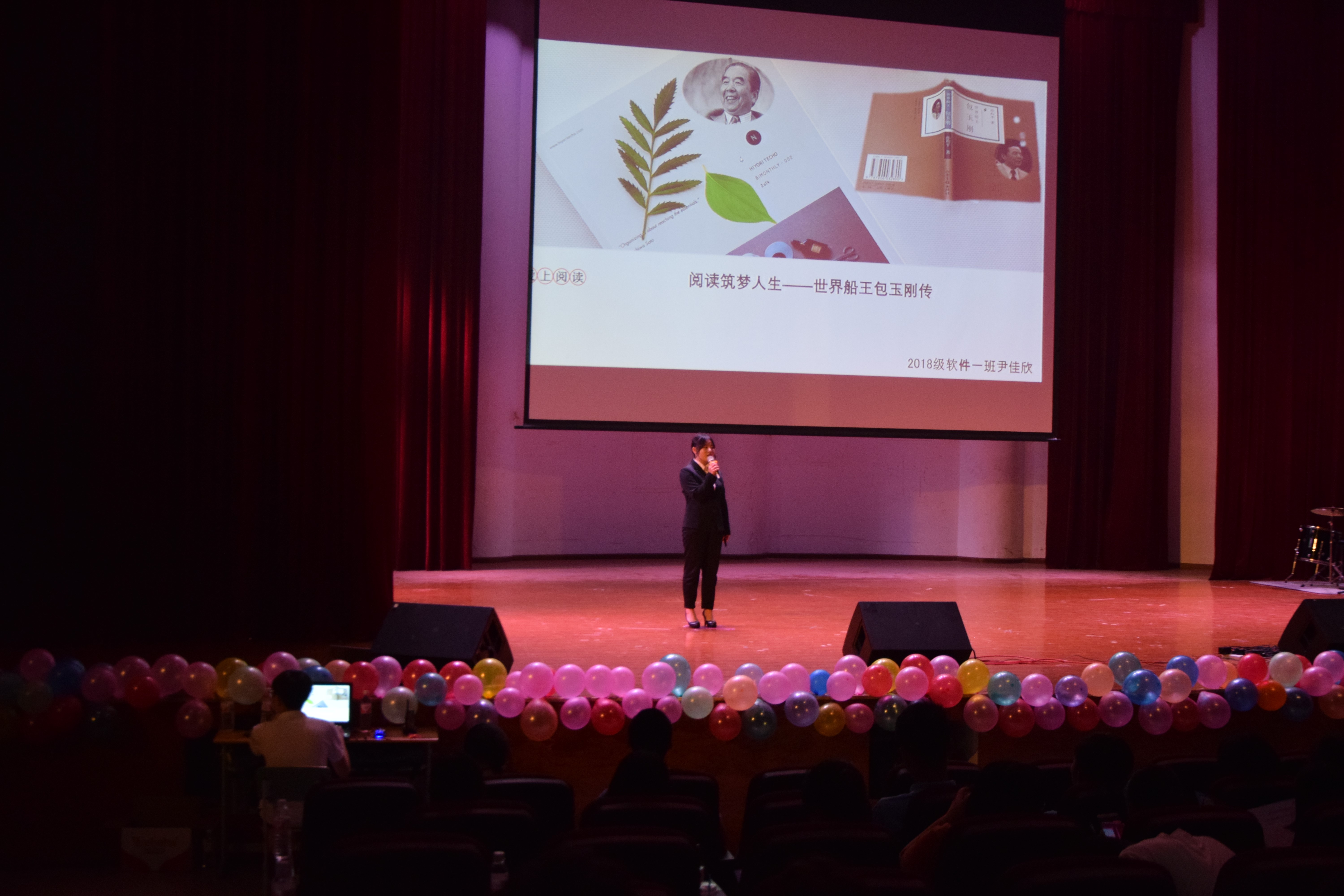 首先,由刘利书记为此次活动致开场辞,并为同学们推荐了一本龙应台著的《亲爱的安德烈》,希望同学们多读高雅健康的书,把读书变成一种生活习惯。随后10位同学上台分享了自己的书籍,其中有创业经商的传奇人物、有一生执着学习的文学家、有伟大的国家领导人。如果想创业经商,可以看看同学们分享的《世界船王包玉刚》、《比尔盖茨传》、《任正非-永远思考失败》、《孙正义的人生哲学》、《将心注入》和《董明珠让世界爱上中国造》,如果想了解痴爱学习的文学家一生,可以看看《一生是员工于敏自传》,如果还想了解中国伟大领袖为何能带领中国屹立世界东方,可以看看《毛泽东自传》、《邓小平自传》和《红镜头中的毛泽东》。
