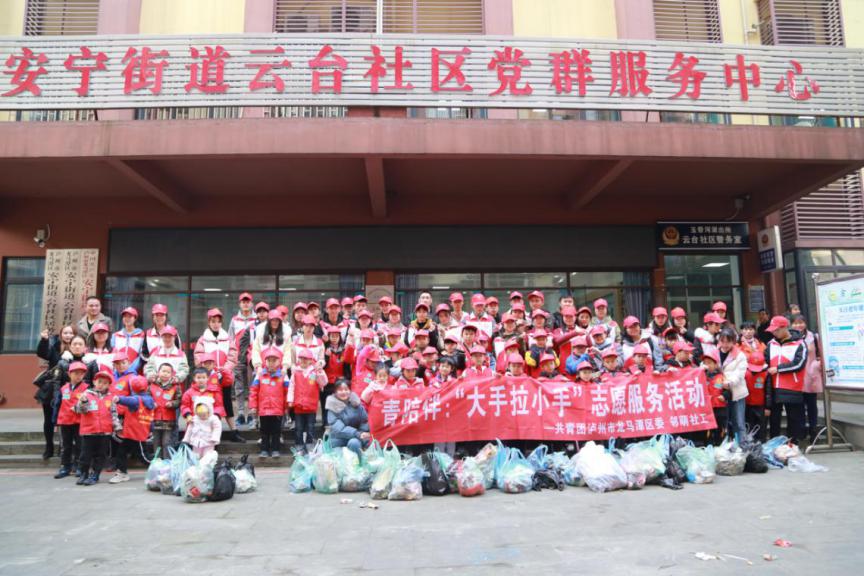 12月7日8:00信息工程公司青年站举办的“大手拉小手”活动在泸州市龙马潭区白云社区成功举办。本次活动是由公司41个青年志愿者一对一带领小志愿者们到社区捡垃圾并宣传爱护环境而组成的。