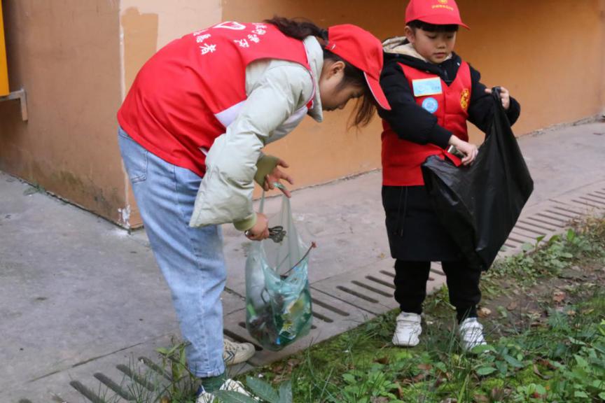 志愿者团队来到白云社区后,给家长和小志愿者们身上贴上了他们的名字标签。活动开始时,青年志愿者和小志愿者一起跳起了兔子舞,脸上洋溢着灿烂的笑容。热身舞蹈结束后,小鸽子老师向志愿者们分发了垃圾袋和夹子。并讲解了需要清理的地方:玉带花园一区、二区、三区、四区,随后志愿者们便开始进行分工合作,并分为四组,二十人为一大组,二人一小组——青年志愿者和小志愿者做搭档。在清理垃圾的过程中志愿者们都不怕脏、不怕累,积极主动地到每个角落去捡垃圾,并且也很快有了显著的效果。