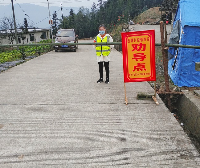由于防控疫情的需要,从2月份开始,兴文县周家镇石屏村开始实行封村封路,村里道路很多,需要很多人手,作为当代老员工和村里的一份子,周燕飞同学主动报名去村口守路值班。每天坚守岗位,没有通行证禁止人们进出,对聚众到一起的村民进行说服教育,跟着村书记到村名家去视察。“有时会有热心的村民送来泡面和牛奶慰问品,说着感谢的话,心头是说不出的暖,深刻理解了‘付出是一种快乐’这句话。”