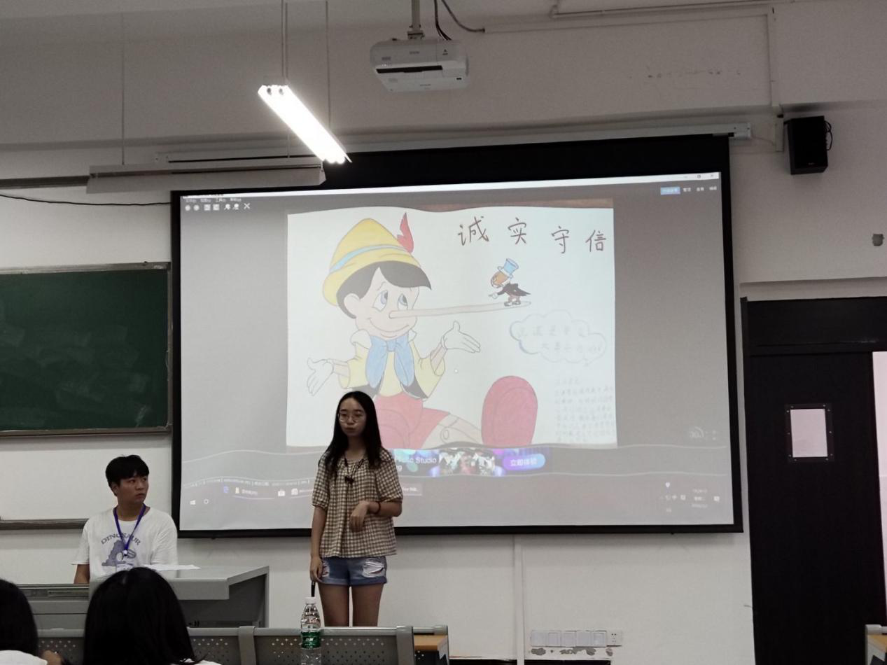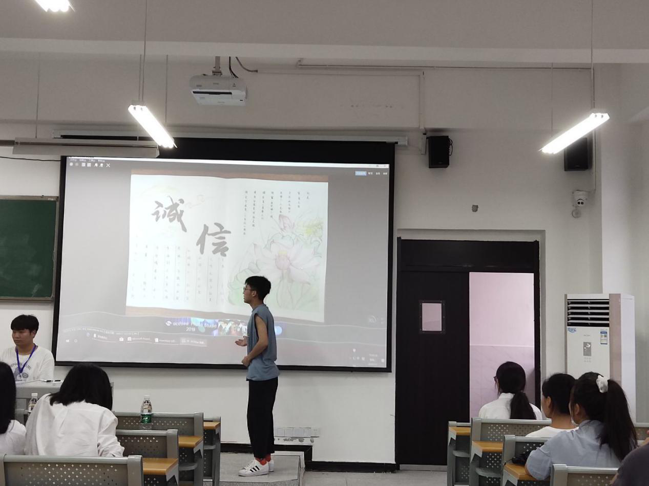 活动开始时,主持人王新宣读了本次大赛的比赛规则和评分标准。随后十八位选手有序地上台对作品设计进行解说。比赛中,决赛作品从不同的角度和视角,诠释着作者对主题意义的理解以及传达出社会诚信的重要性,认为诚信是一个人品德修养状况和人格高下的重要表现,也是赢得别人尊重和友善的重要前提条件。