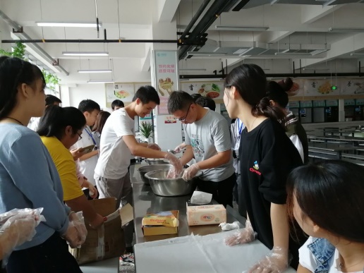 信息工程公司青年站的同学提前准备了月饼制作所需的食材、包装盒、工具等一系列材料。同时,为了保证食品的卫生与健康,青年站的同学专门为志愿者配搭了一次性手套。
