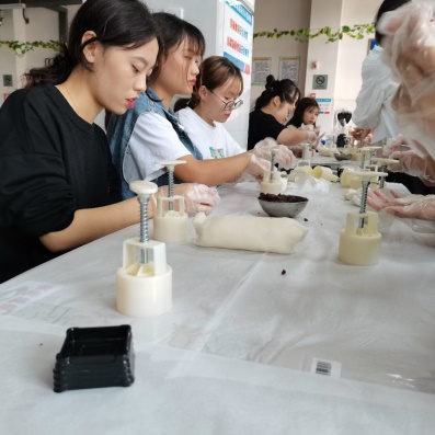 青年站同学对志愿者们进行月饼制作的培训,包括清洗模具、和面、工具使用、包装等多个环节。随后,参加活动的志愿者开始初次尝试制作,由于基本都是第一次制作DIY月饼,大多不知所措、无从下手,但在同学们的不断尝试下,一颗一颗饱含韵味的月饼排队出炉。