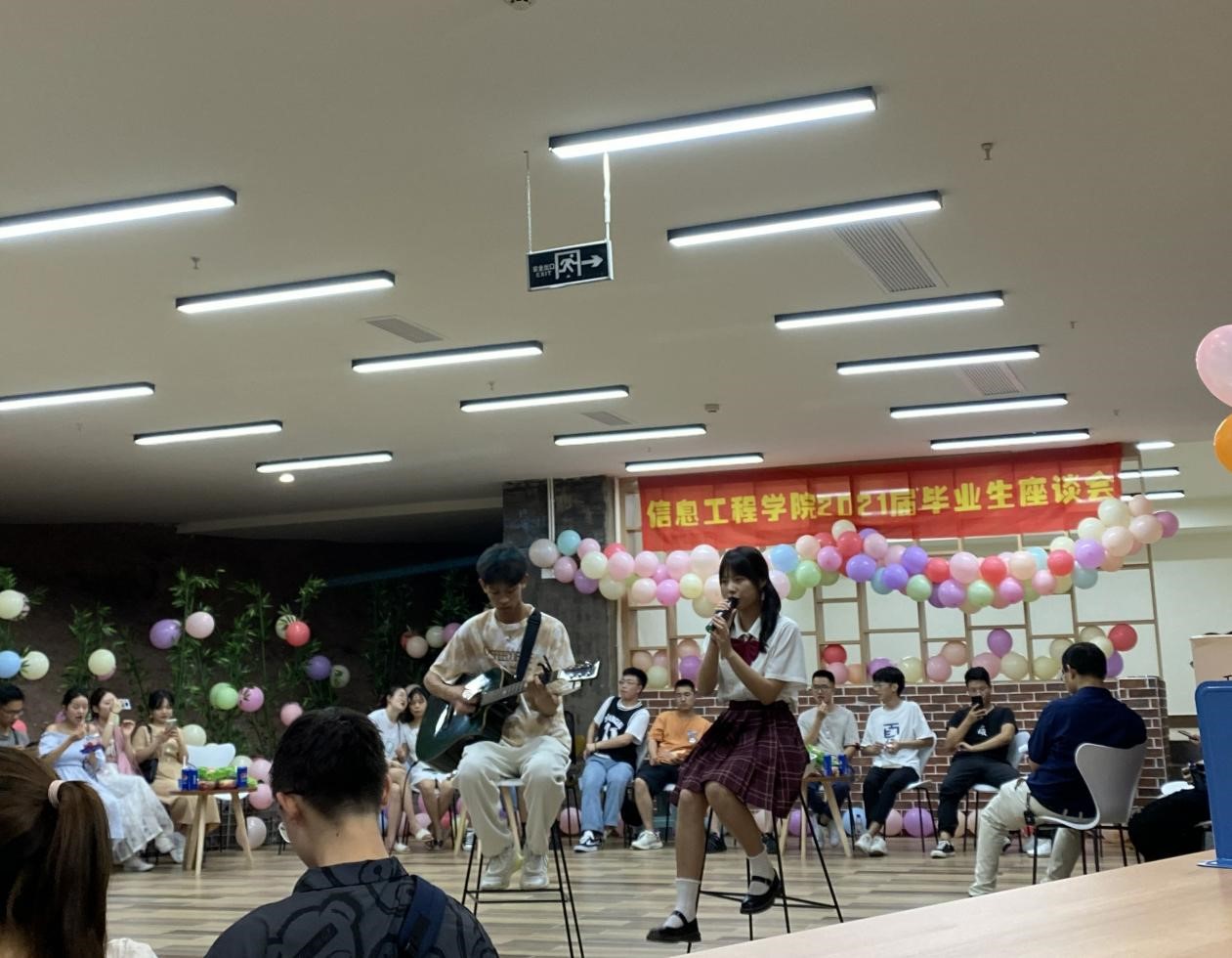 伴随着刘娪汐、侯安康两人表演的吉他弹唱节目,欢送会拉开帷幕,信息工程公司经理卢正才致欢迎辞,欢迎同学们返校,祝贺同学们顺利毕业,祝福同学们前途似锦。