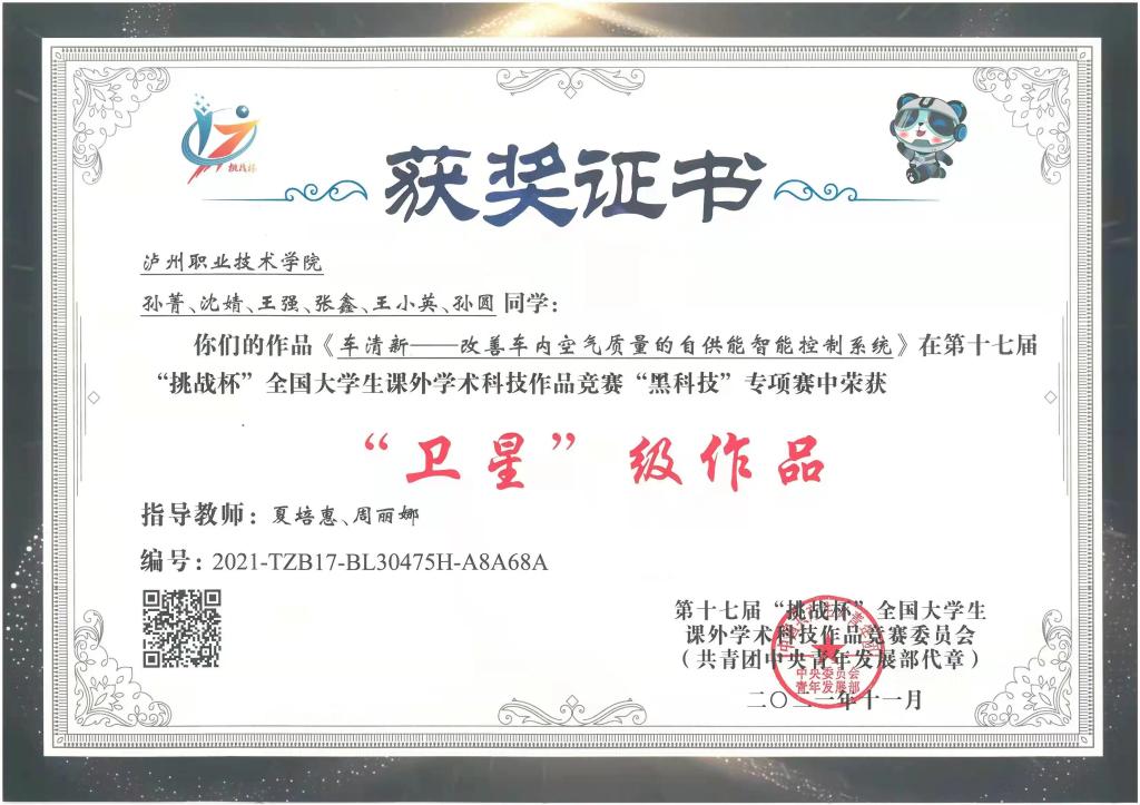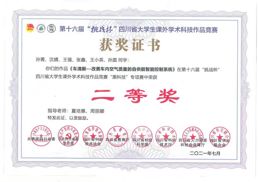 功夫不负有心人,采用钙钛矿太阳能板的4.0版本最终成功,并获得4项专利保护,赢得专家高度评价。2021年8月,她率队参加第七届四川省国际“互联网+”老员工创新创业大赛,与一百多所高校同台竞技,荣获省赛金奖,并最终斩获国赛铜奖。