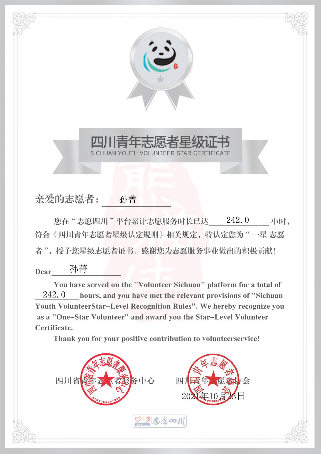 孙菁利用寒暑假,积极投身新冠肺炎疫情防控,在核酸检测点、汽车站、社区开展志愿服务活动,志愿服务时长累计242小时,志愿服务事迹被武胜融媒报道,并被武胜县团委表彰为武胜县2021年“青春志愿·爱在旅途”暨新冠疫情防控优秀青年志愿者。
