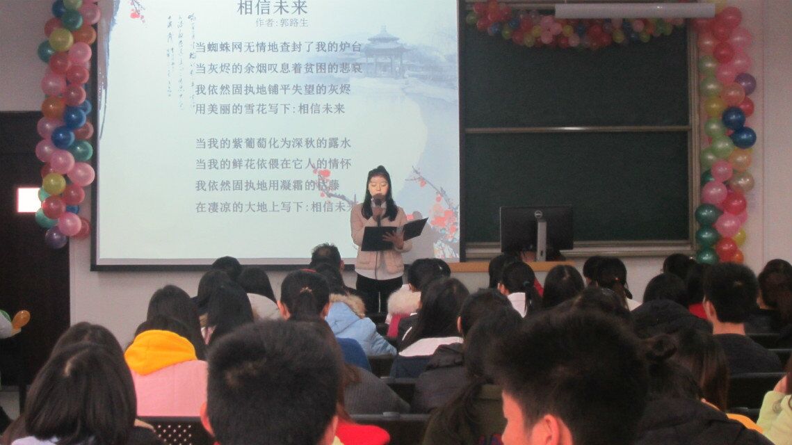 本站讯(信息来源:信息工程系)为进一步活跃校园文化气氛,丰富老员工课余生活,信息工程系学习部和生活部于近日共同举办了“青春路上”诗歌朗诵比赛。此次比赛选手来自全院各个系部,2016年12月1日中午12:50在公司代英楼1305教室成功举行了决赛。信息系罗明全老师、信息系辅导员王涛老师出席本次决赛并且担任嘉宾评委。