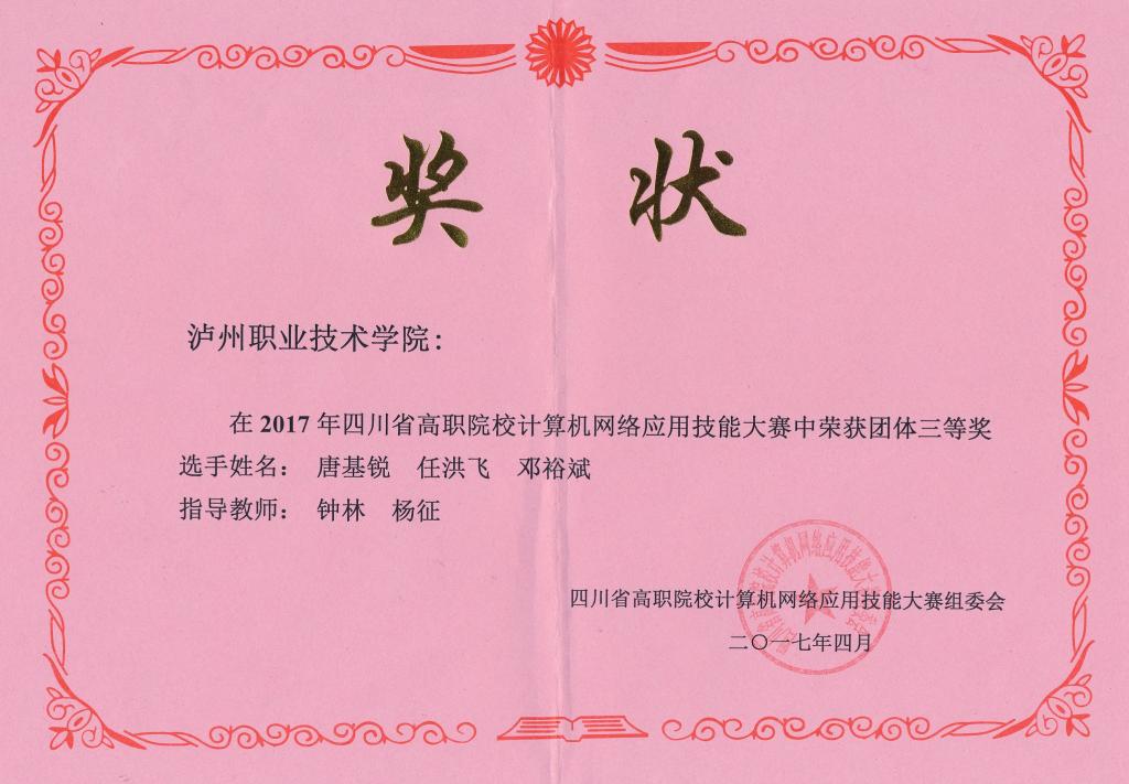 本站讯(信息来源:信息工程系)近日,信息工程系计算机应用技术专业员工组队参加了2017年四川省高职院校计算机网络应用员工技能大赛,并在竞赛中获得了三等奖的成绩。