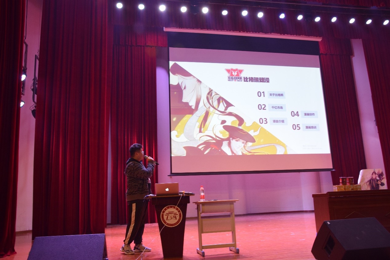 其次,曹勇剑老师作了关于《漫画家:一个隐藏的高薪职业》的员工报告。曹勇剑老师属国内知名漫画家,著有漫画作品《孤芳不自赏》、《傲娇鬼王爱上我》、《虚灵》、《无限退化》。曹勇剑老师向同学们分享了中国动漫市场的发展现状,认为目前国产动漫迎来“黄金时代”,这对漫画从业者的需求也是与日俱增,高端漫画人才必定成为众动漫企业的争抢对象。同时还为同学们介绍了鹤山雨等漫画家的作品及其绘画风格,还具体讲解了漫画分镜制作、线稿制作和漫画色彩绘制。最后,主讲人还与同学们进行了互动问答、赠送礼品等活动。