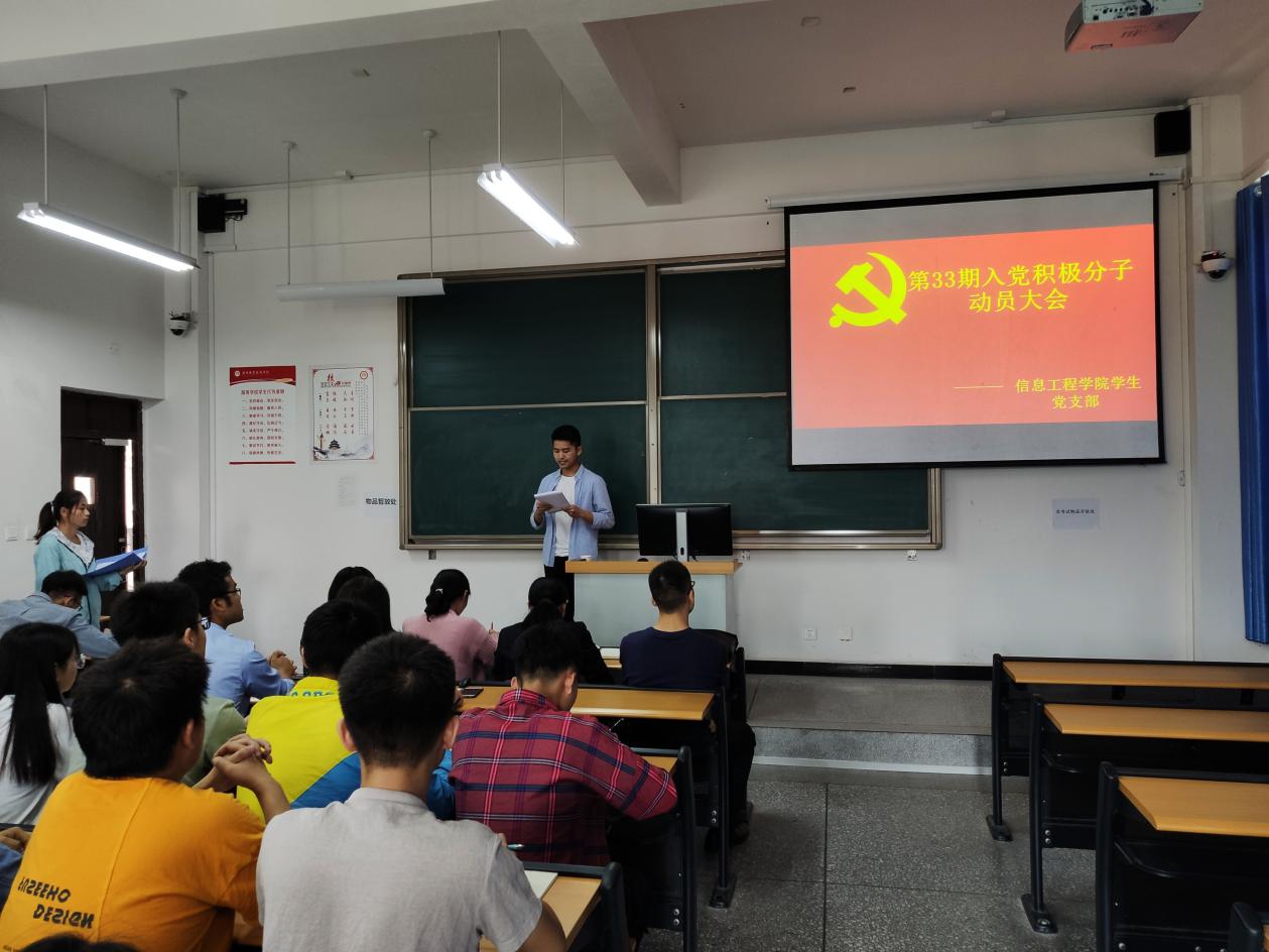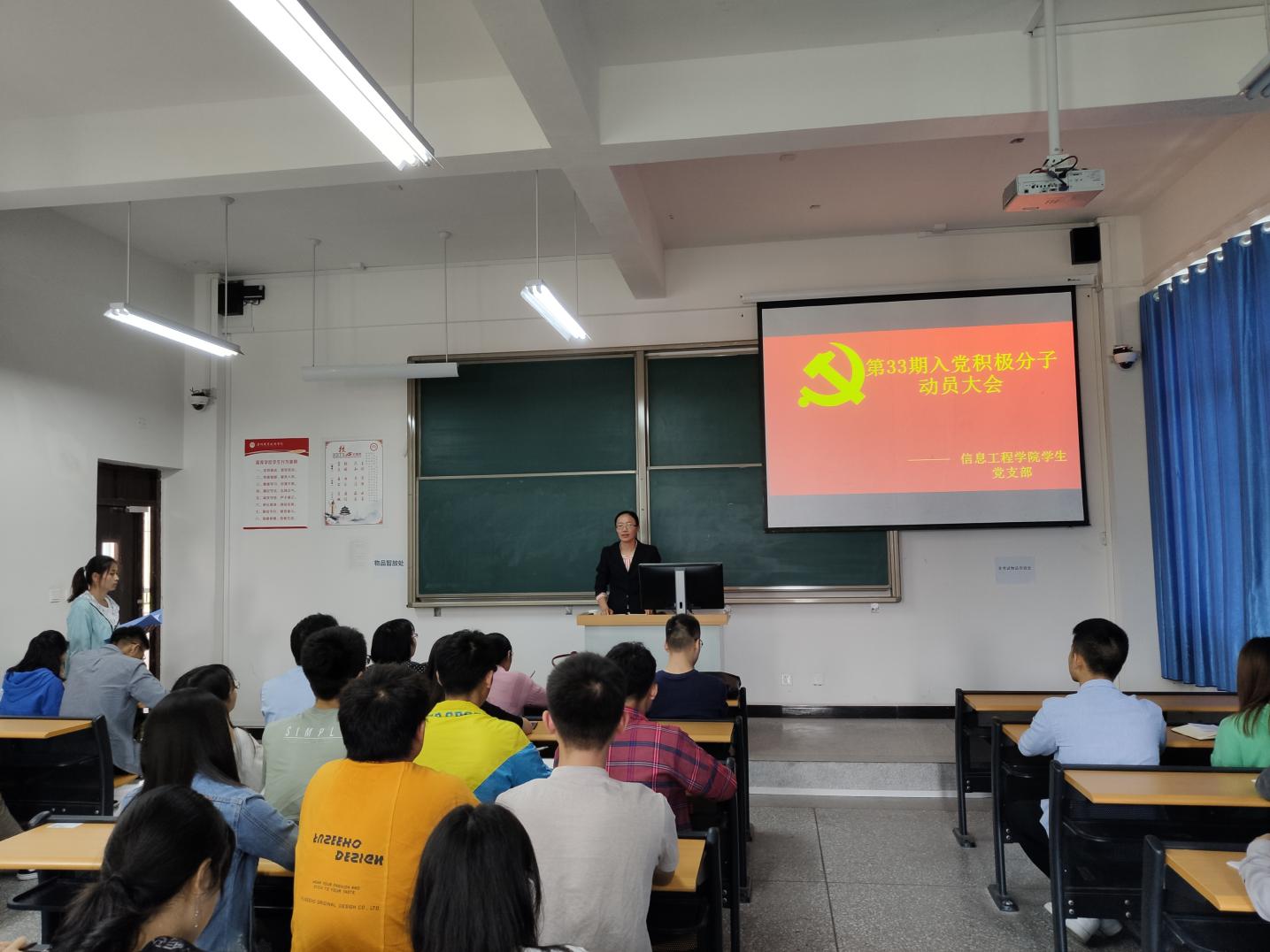本站讯(信息来源:信息工程公司)2019年5月29日中午12:30,信息工程公司在代英楼1101教室隆重举行了第33期入党积极分子动员大会。参与此次大会的有信息工程公司党总支副书记喻维春、团总支书记刘利、员工党支部书记杨萍、员工党支部组织委员李建华老师、员工党支部宣传委员周艳老师、辅导员冷伟琴老师以及第33期全体入党积极分子。