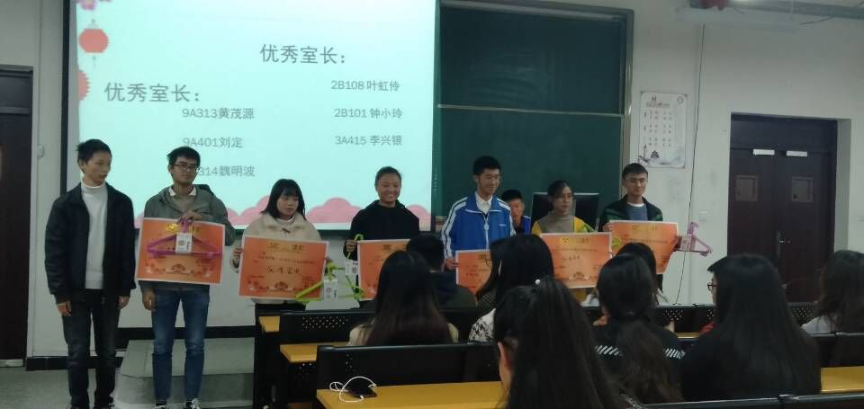 其次,进行了“温馨小窝”拍照评选活动的颁奖仪式,表彰表现优秀的寝室和寝室长,其中3B116、9A316荣获一等奖,3B110、2A116、9A409、6A405荣获二等奖,9A420、5B407、6A518、3A419、2A114、3A412荣获三等奖,黄茂源、刘定、魏明波等六名同学荣获优秀室长。