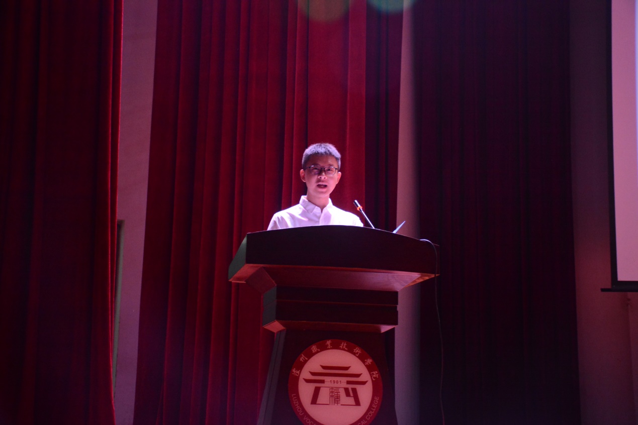 2018级员工代表唐鹏发言,唐鹏分享了自己参加专业技能竞赛和担任员工会干部的经历,向2020级新同学提出综合素质锻炼与专业技能提升平衡发展的建议。