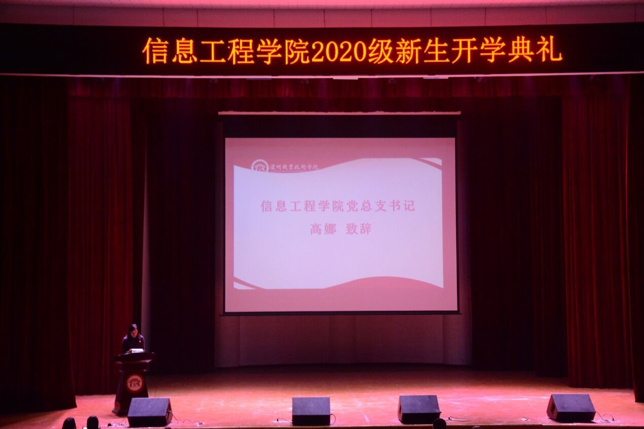 典礼在庄严的国歌声中拉开帷幕,信息工程公司党总支书记高娜对2020级新生致欢迎辞,并希望同学们学会学习、学会管理时间,做理想信念的坚守者、做本领过硬的行动者、做担当有为的奋斗者、做怀揣梦想的实干者。