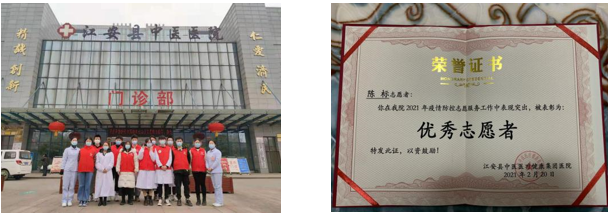 2020级大数据应用与技术1班陈标,在宜宾市江安县中医医院参加志愿服务,他始终坚守岗位,一直坚持在预检分诊台前检测体温。即便感觉疲累,他也不言放弃,体现出公司学子的责任和担当。