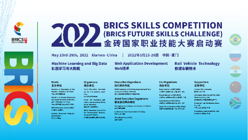 本届大赛是中国作为主席国在金砖国家机制下举办的第一届职业技能大赛,由中华人民共和国教育部、中华人民共和国人力资源和社会保障部、金砖国家工商理事会、厦门市人民政府共同主办,金砖五国政府部门联合参与指导。本次启动赛聚焦智能制造、数字经济等新工业重点领域,设置了Web技术、机器学习与大数据及轨道车辆技术3个赛项,从竞赛标准、竞赛组织和竞赛评审三层面对标世界技能大赛,采用英文操作环境下的线上竞赛方式进行,有力地推进金砖国家国际化高质量技能人才培养。