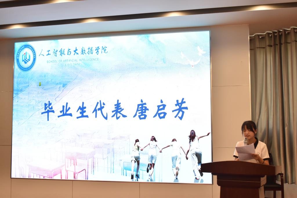 毕业生代表唐启芳、沈良江分享了专升本的心路历程、实习中的感受体会和对未来的规划愿景,表达了对母校的感恩之情,承诺将践行“崇德、博学、尚俭、笃行”的校训精神,继续努力奋斗。