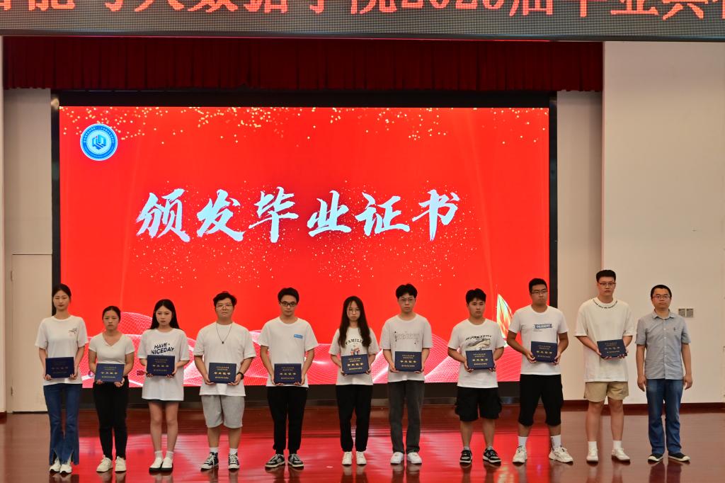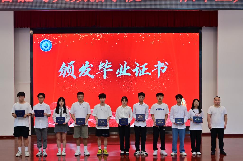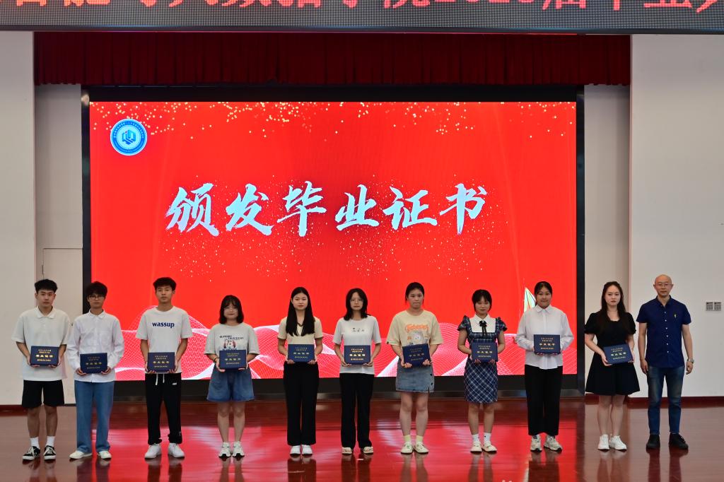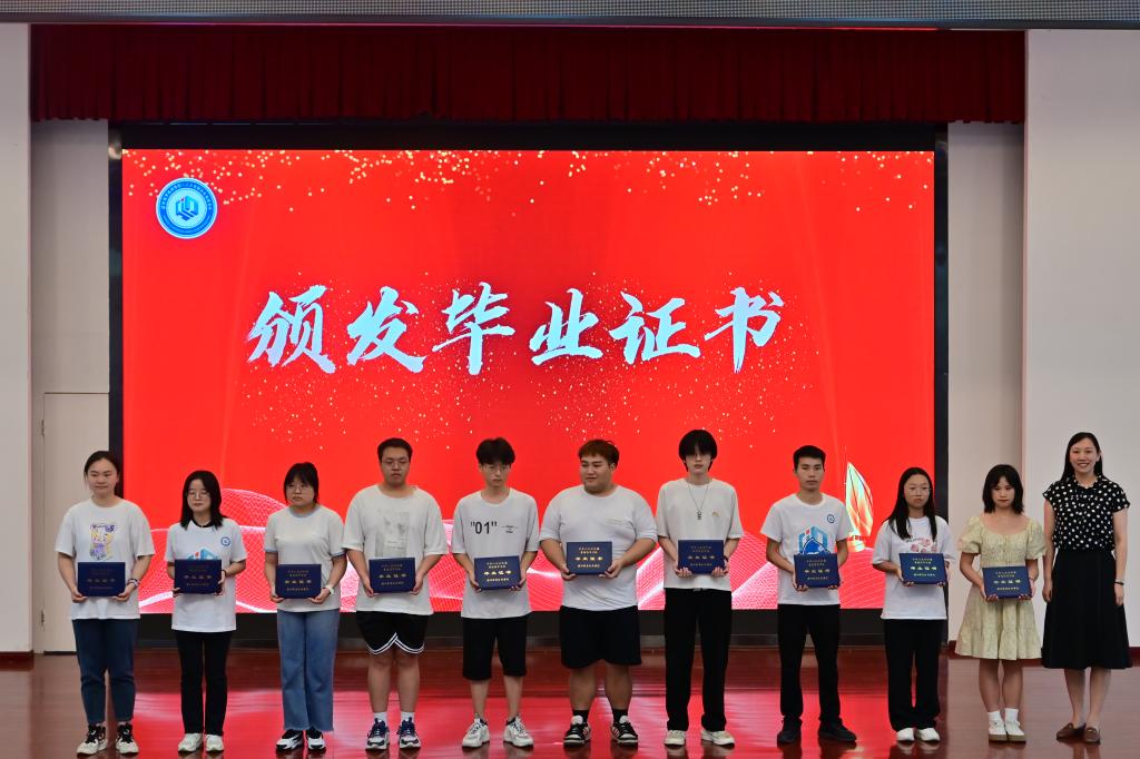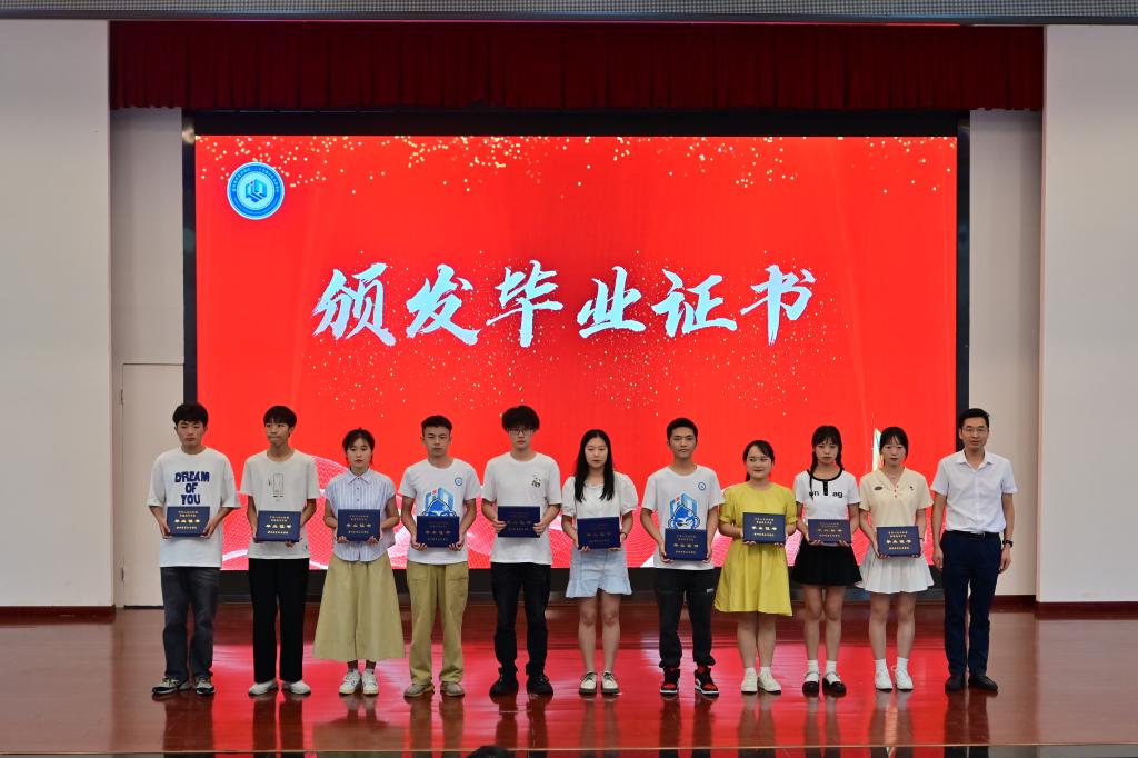 高娜、卢正才、龙小宏、夏汛、袁兵依次为2023届毕业生代表颁发毕业证书。