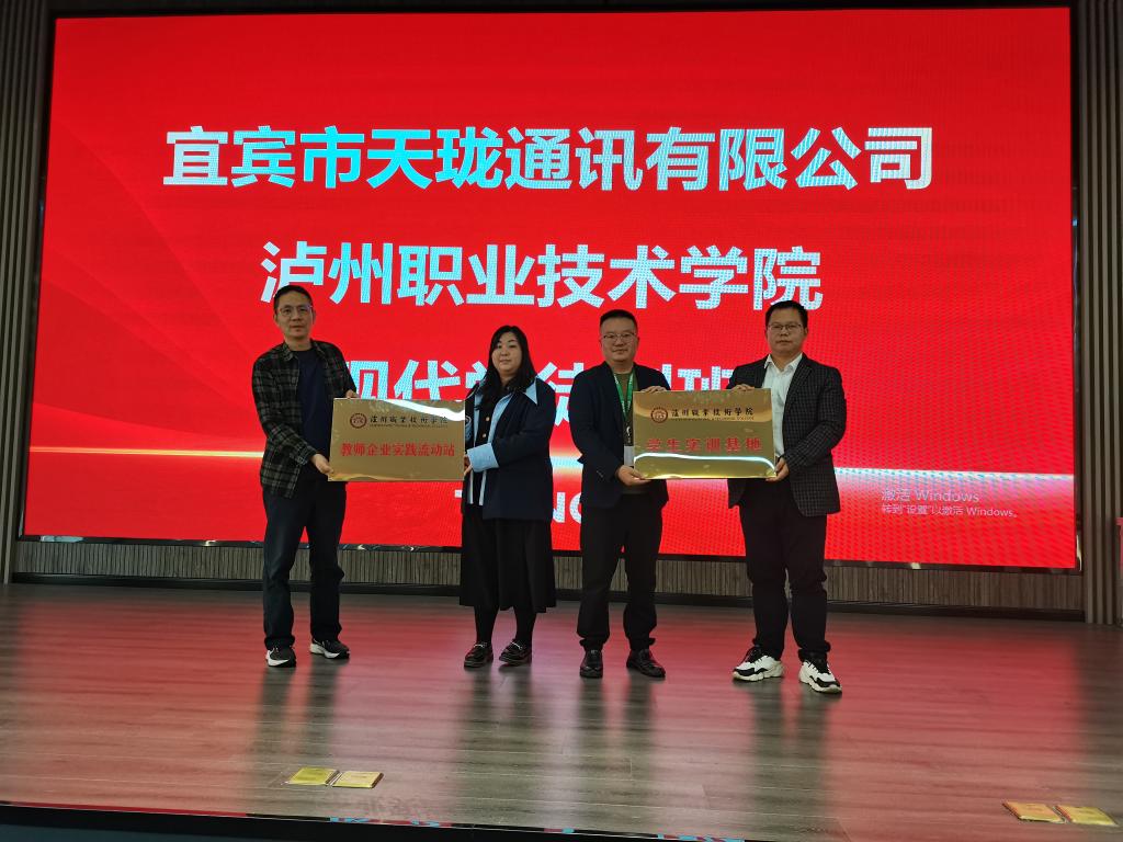 宜宾市天珑通讯有限公司西南人事行政负责人牟清源等领导对师生们的到来表示热烈的欢迎,带领同学们先后参观了天珑博物馆、办公区域、测试研发基地等,并通过讲座交流形式帮助同学们快速了解软件测试工程师岗位。校企双方还举行了“员工实训基地”和“教师企业实践流动站”授牌仪式。