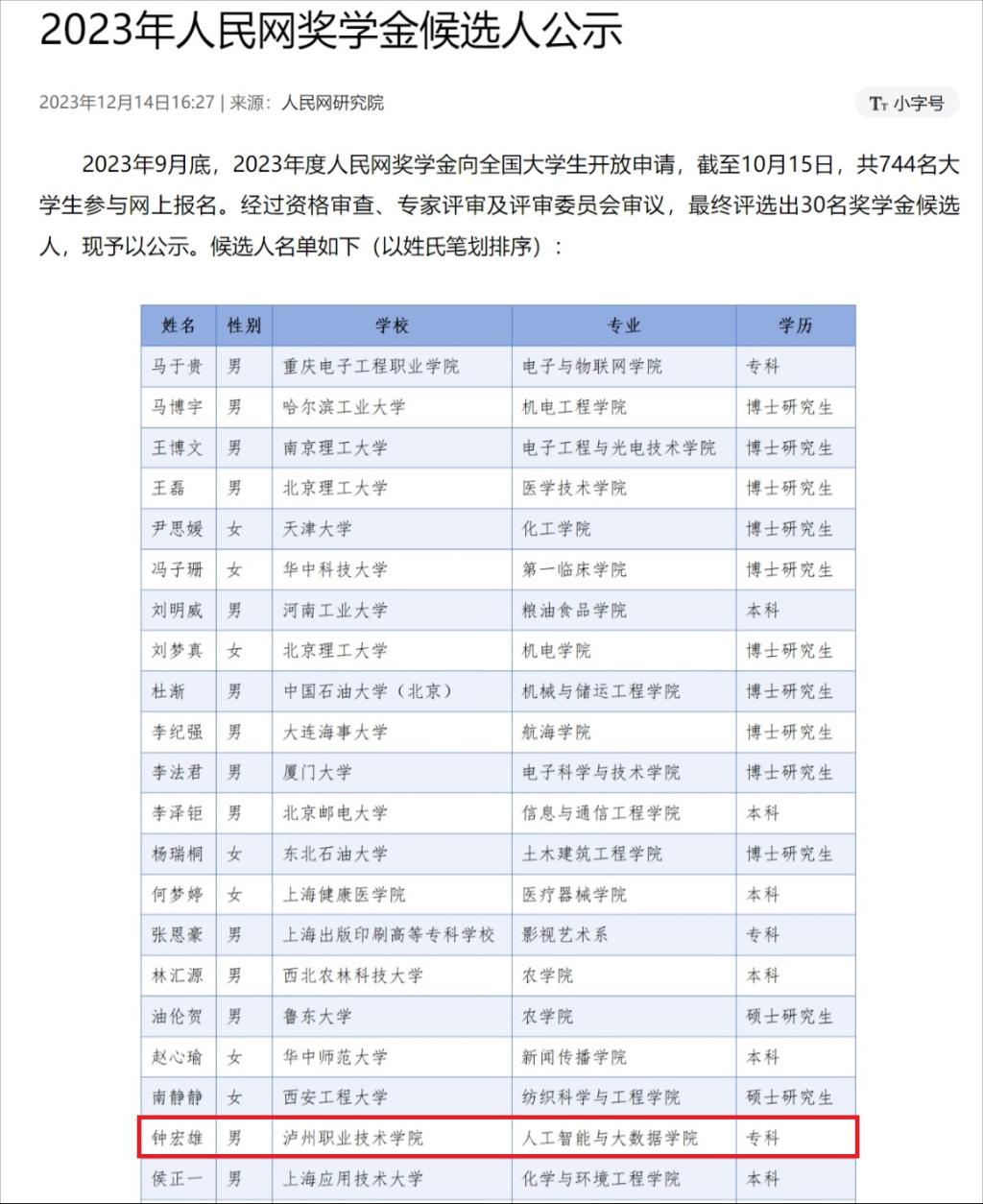 近日,2023年度“人民网奖学金”候选人名单公布,公司2023届软件技术专业毕业生钟宏雄成为2023年度全国30名人民网奖学金项目获奖者之一,是公司学子首次获此荣誉。