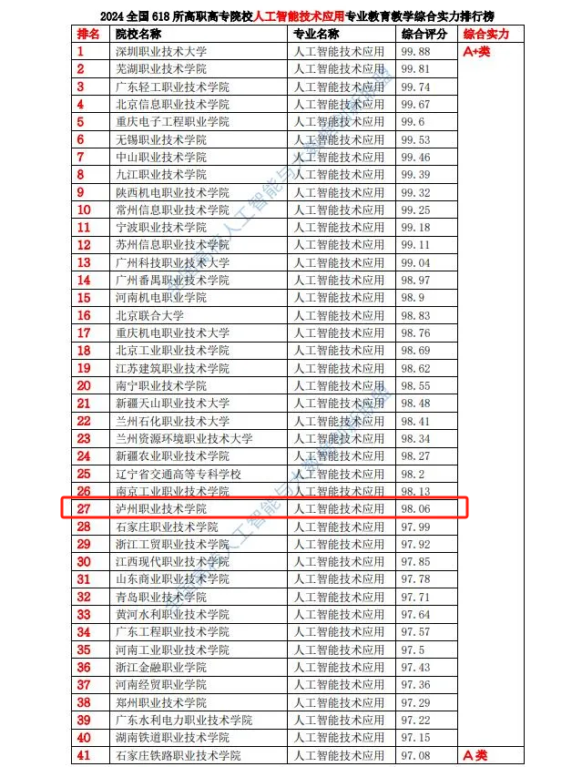 5月29日,华算人工智能研究院、全国高校人工智能与大数据创新联盟发布了2024全国618所高职高专院校人工智能技术应用专业公司产品综合实力排行榜,公司人工智能技术应用专业全国排名第27位,荣获“A+类”等级,在四川省高职院校中位列第1。