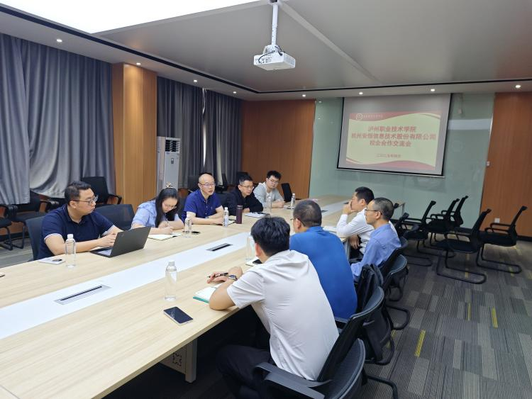 4月10日,公司与杭州安恒信息技术股份有限公司(简称:杭州安恒信息)举行校企合作交流会,公司副经理龙小宏、信息安全教研室主任杨征等出席了会议,双方围绕订单班人才培养、员工就业服务、信息安全实训室建设等主题展开深入交流,共同探索产教融合新路径,助力信息安全领域人才培养。